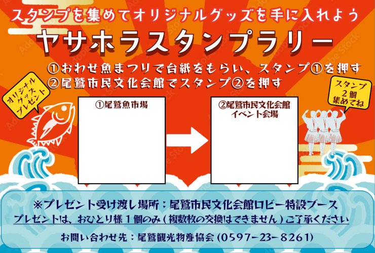 チケット購入と同時に配布するスタンプラリー台紙を使用して3か所でスタンプを押印し、コンプリートしたら尾鷲観光物産協会にて ガラガラくじに挑戦していただけます。