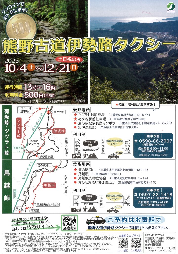 12月212025 【ワンコインでオトクに乗車!】熊野古道伊勢路タクシー 【2025.10.4-12.21の土日祝】 詳しくは下記をご覧ください 熊野古道伊勢路タクシー|ワンコインでおトクに峠を楽しもう