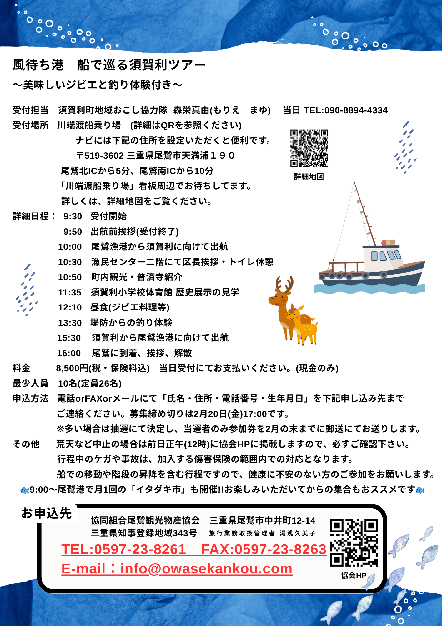 行程 尾鷲港~~船~~須賀利・・・町内観光・普済寺・・・須賀利の歴史展示見学・・・昼食(ジビエ料理)・・・釣り体験~~船~~尾鷲港