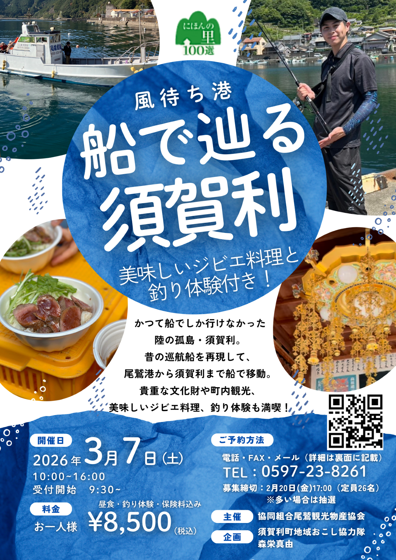 3/7 「風待ち港 船で辿る須賀利ツアー」を実施します~美味しいジビエ料理と釣り体験付き!~